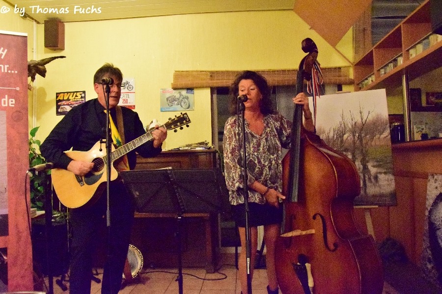 Überpünktliche 5 Minuten vor der Zeit kamen Gabi Spilker (Upright Bass und Voc.) und Uli Voelker (Git., Banjo und voc.) singend durch das Publikum zur Bühne und los ging der absolute Musikmarathon. 78 Titel hatten Gabi und Uli auf einer Wunschtitelliste im Publikum verteilt und es wurde reichlich gewünscht, denn es waren alle Plätze belegt.